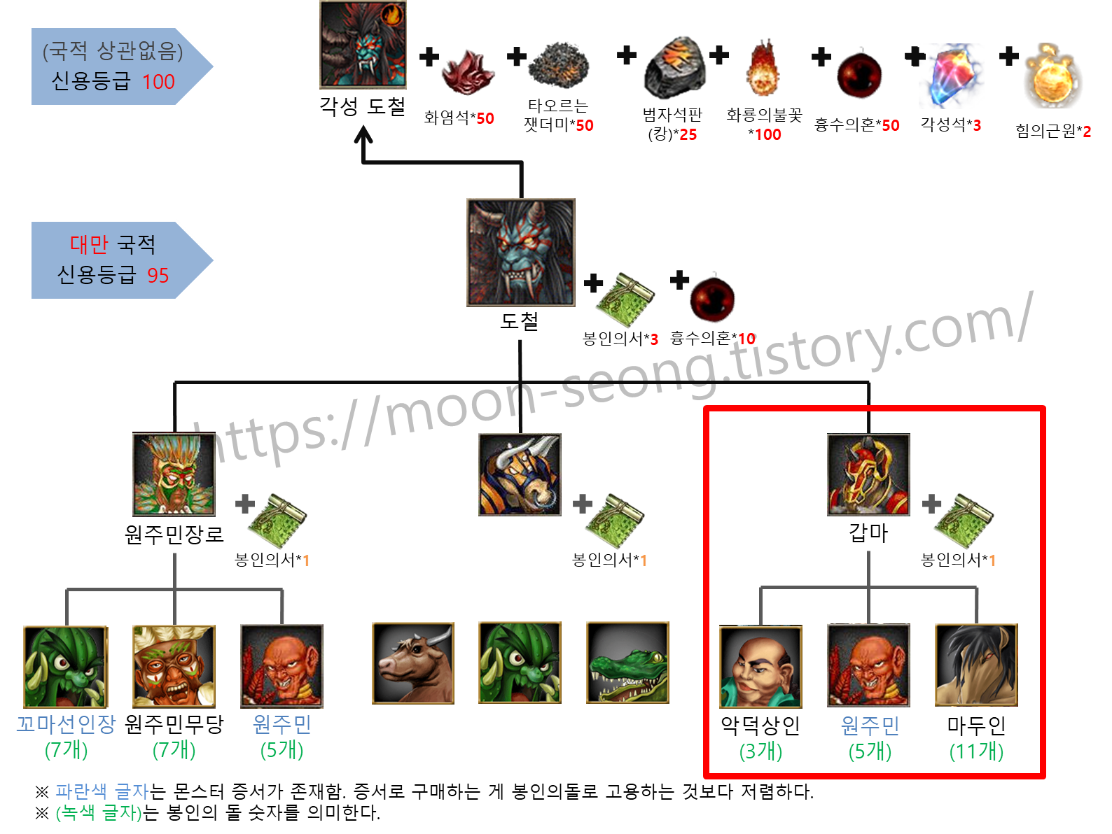 화염석50개 + 타오르는잿더미50개 + 범자석판(캉)25개 + 화룡의불꽃100개 + 각성석3개 + 힘의근원2개